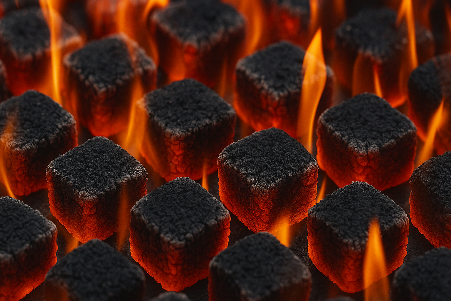 Hexagonal coconut charcoal briquettes with a long burn time and steady heat, ideal for BBQ and grilling.